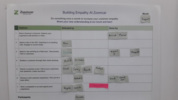 I recently led an experience mapping workshop at Zoomcar in Bangalore. It was very challenging and in the end, very satisfying. Many smart people around the table. Now we need to turn our insights into measurable improvements. For more information, see my portfolio piece on the same subject.