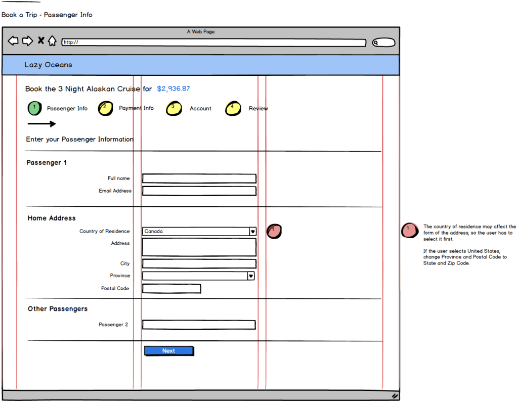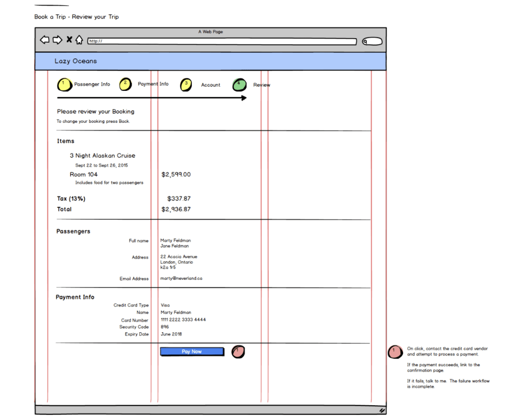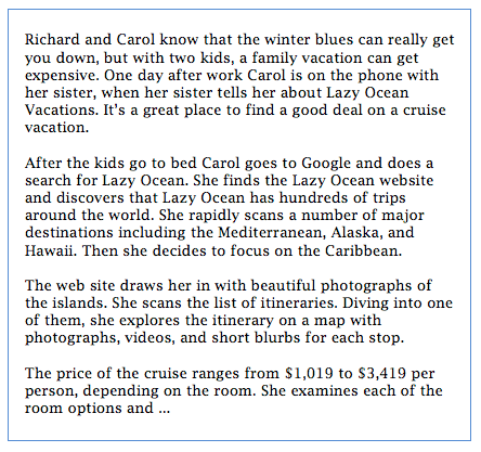 - I wrote a scenario, a brief story demonstrating how Carol will use the Lazy Oceans web site to find and purchase a cruise vacation. Then I drew an exhaustive scenario flow chart of the search, browse, quotation and purchase options on the Lazy Oceans web site.