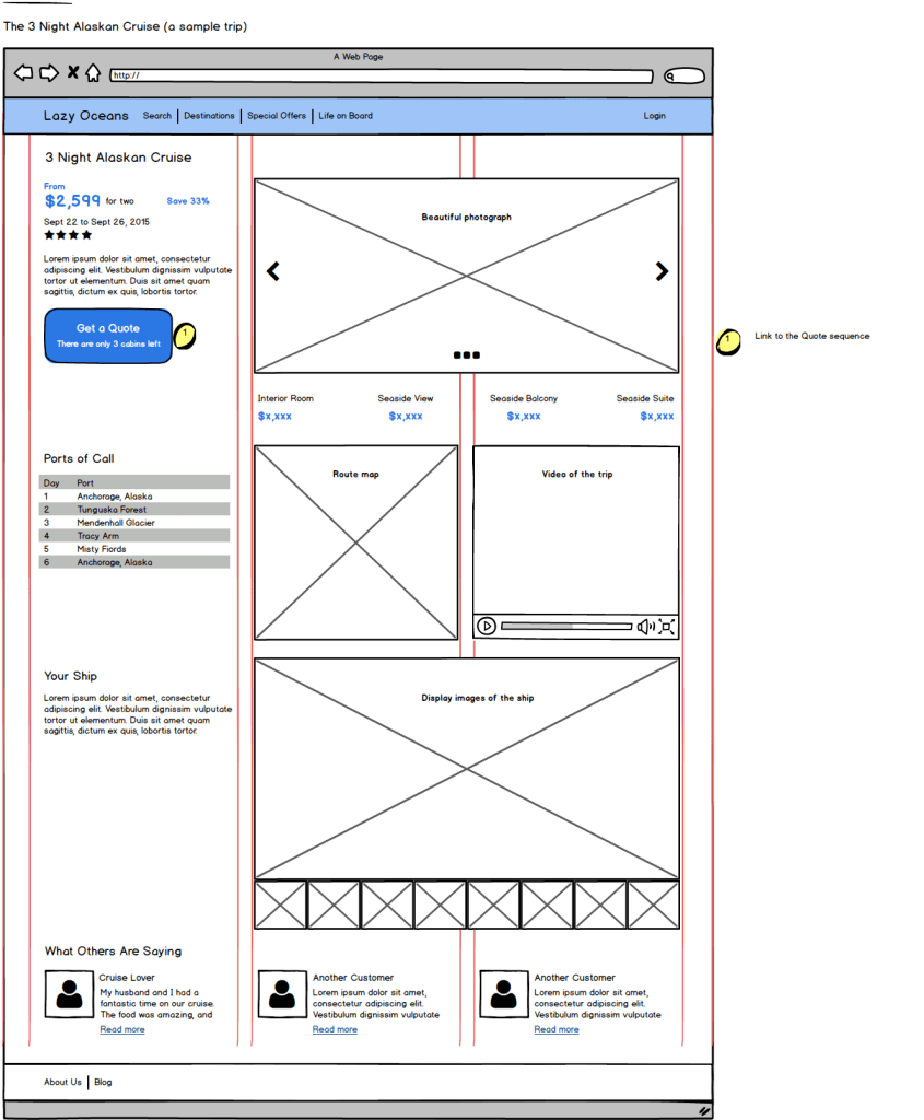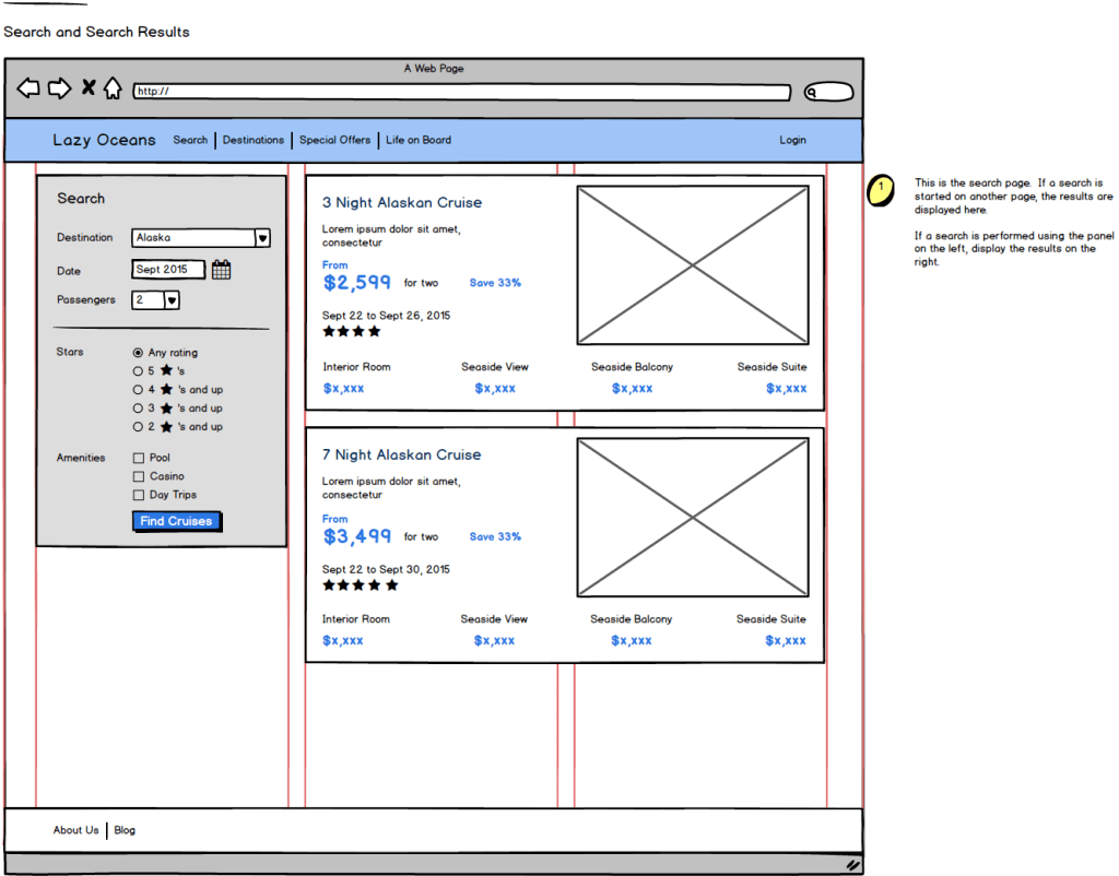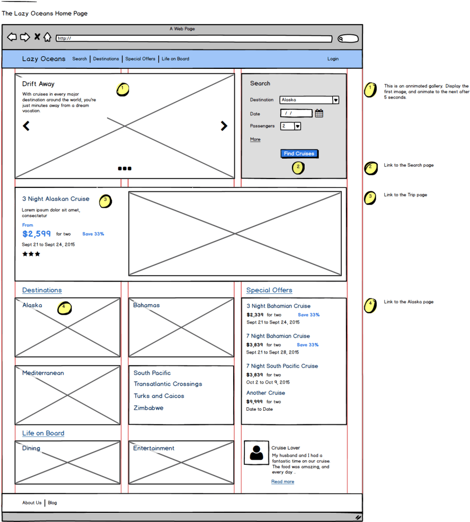 In 2015, I designed a responsive mobile web and web application called Lazy Oceans. This passion project allows the user to explore the cruise vacations offered by a fictitious company, search for trips, and book one.