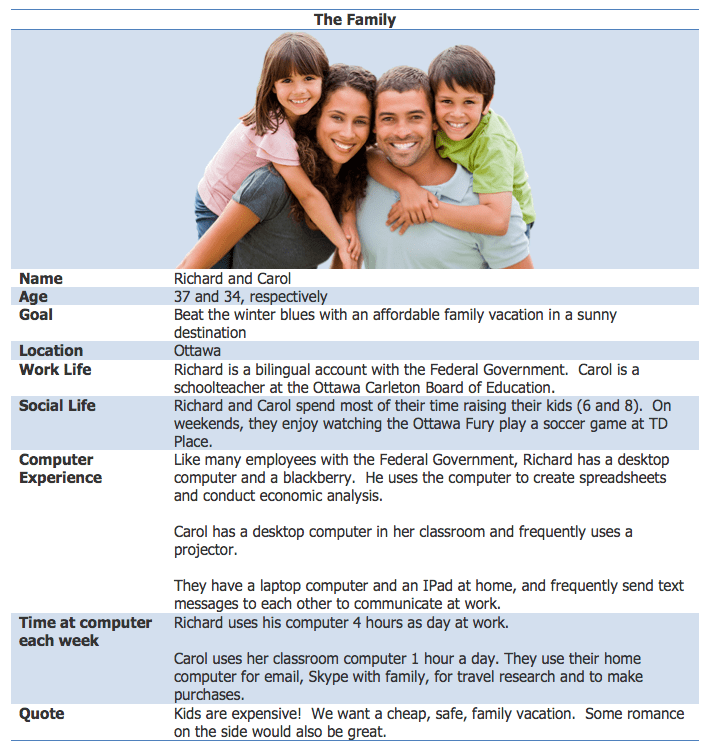 - After defining the general business model for Lazy Oceans, I developed a number of personas for the site, including one for Richard and Carol, a family with two kids.